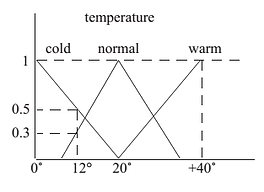 An example of Fuzzy Logic System is an electric heater. If the room temperature is 12 degrees Celsius, the membership function of the fuzzy input should be