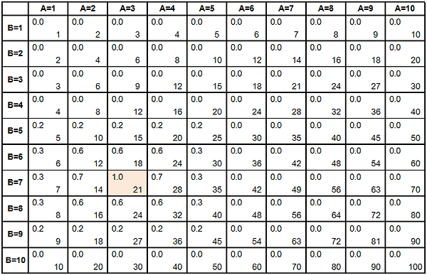 A = 3 = 0.3/1 + 0.7/2 + 1/3 + 0.7/4 + 0.3/5 B = 7 = 0.2/5 + 0.6/6 + 1/7 + 0.6/8 + 0.2/9
